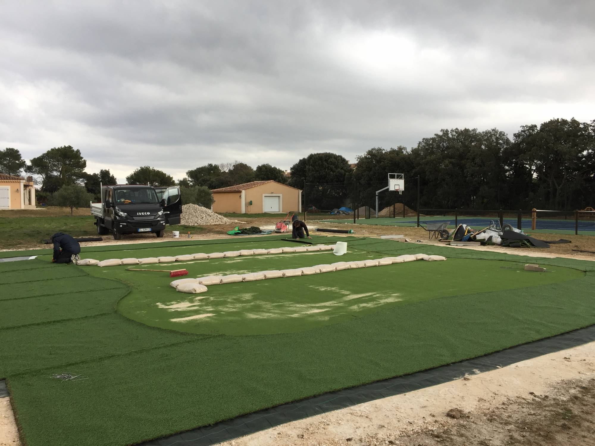 Ici, la surface du green artificiel justifiait l’appel aux engins mécaniques pour aider nos poseurs de green synthétique.