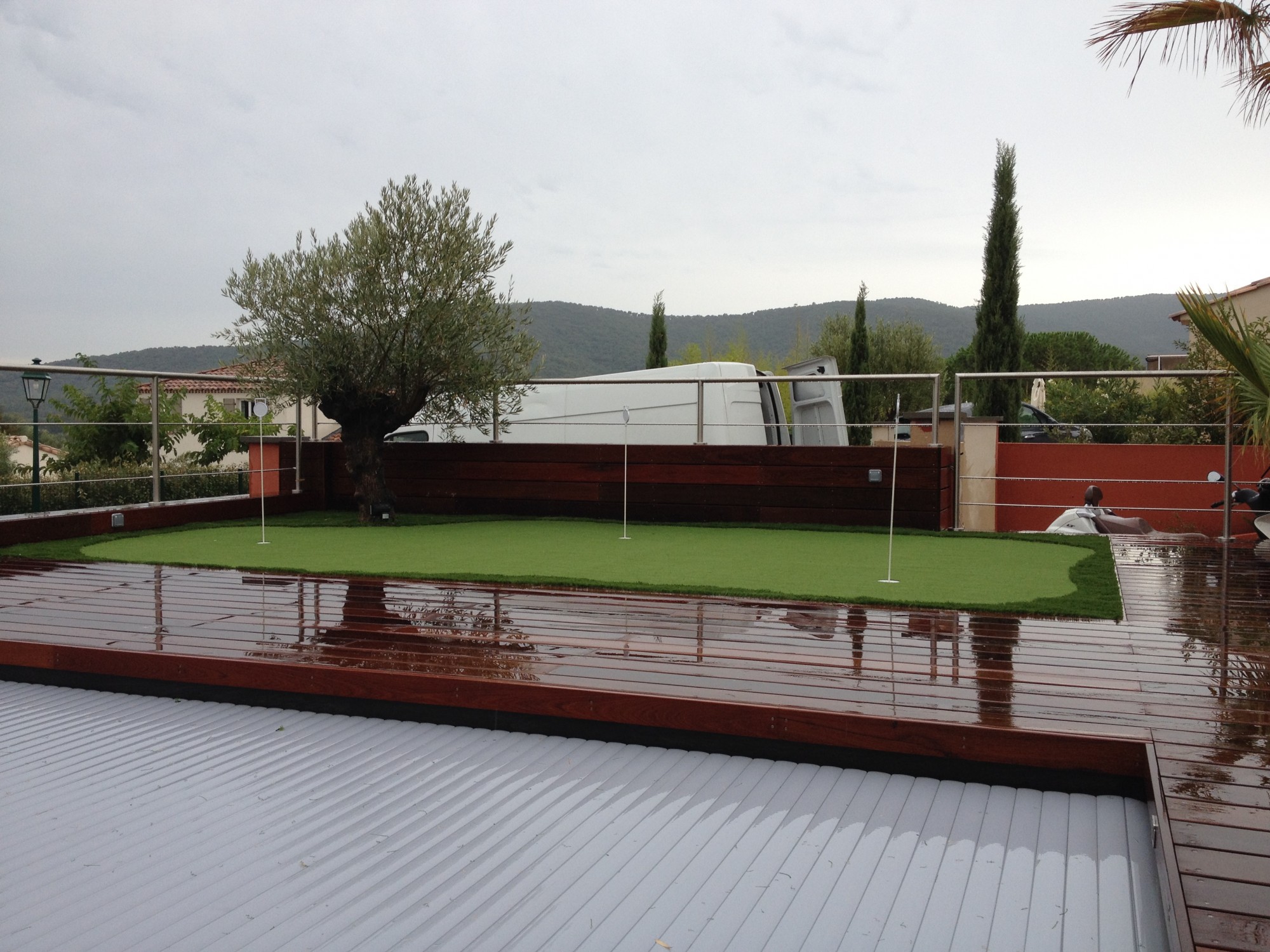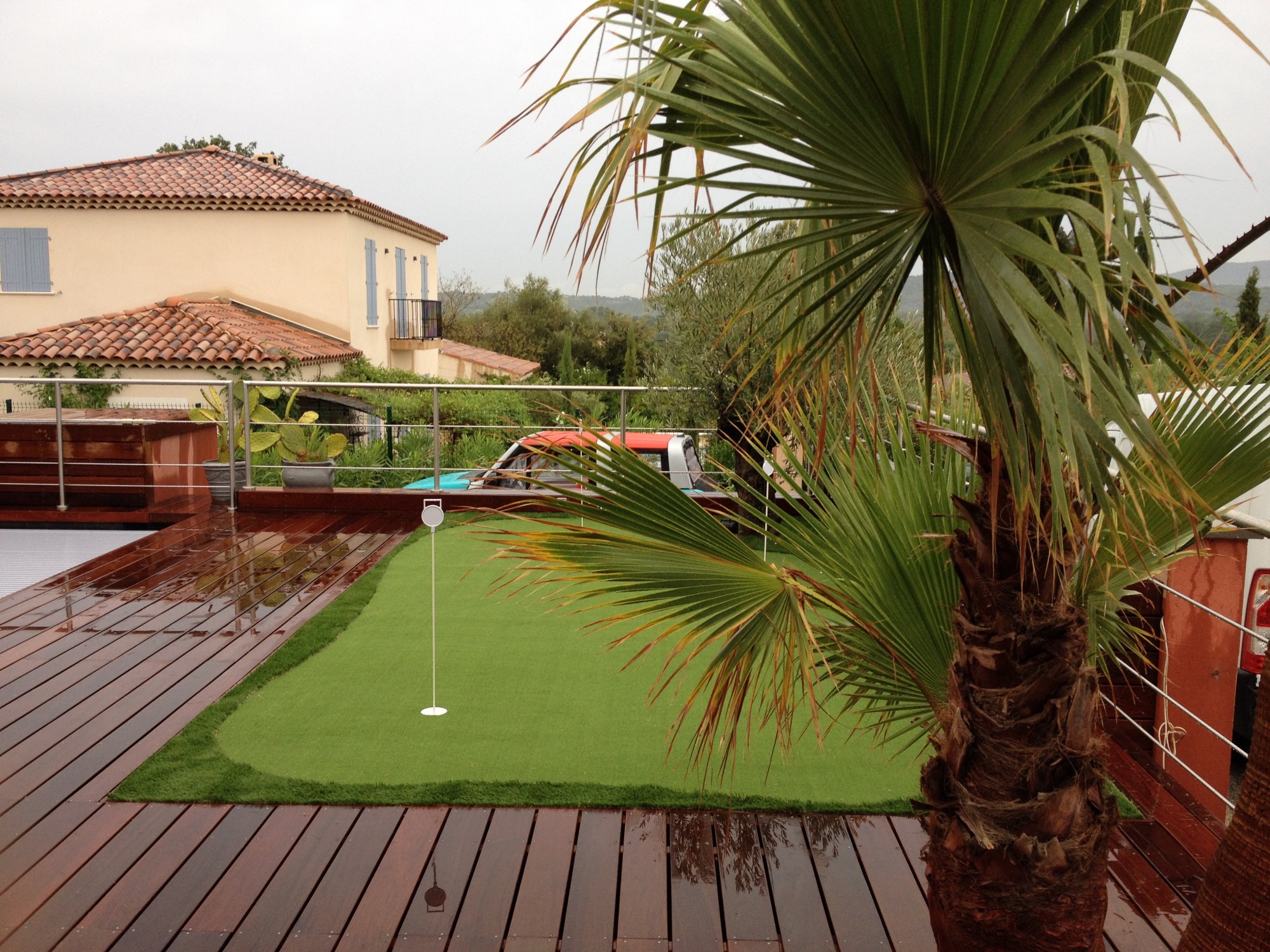 La pose du putting green synthétique se fait sur une surface dure.