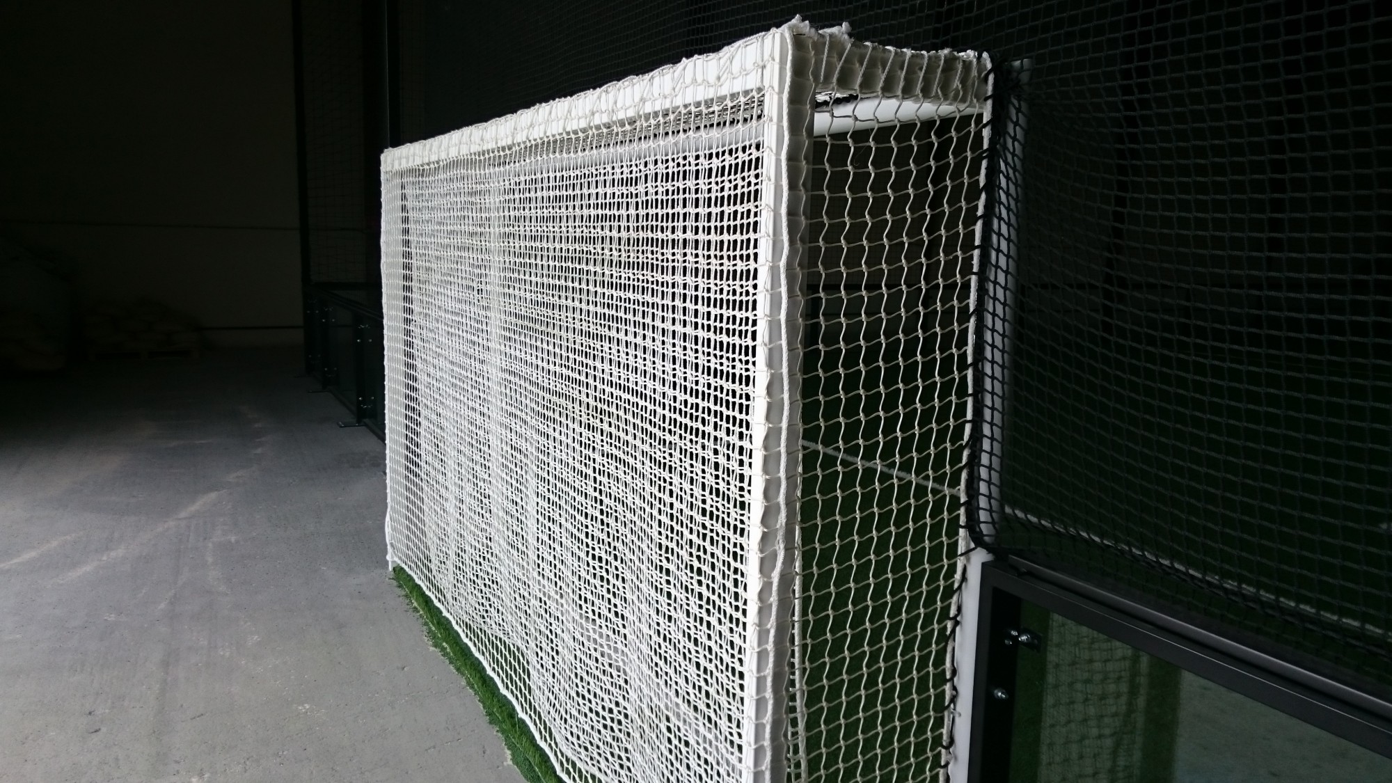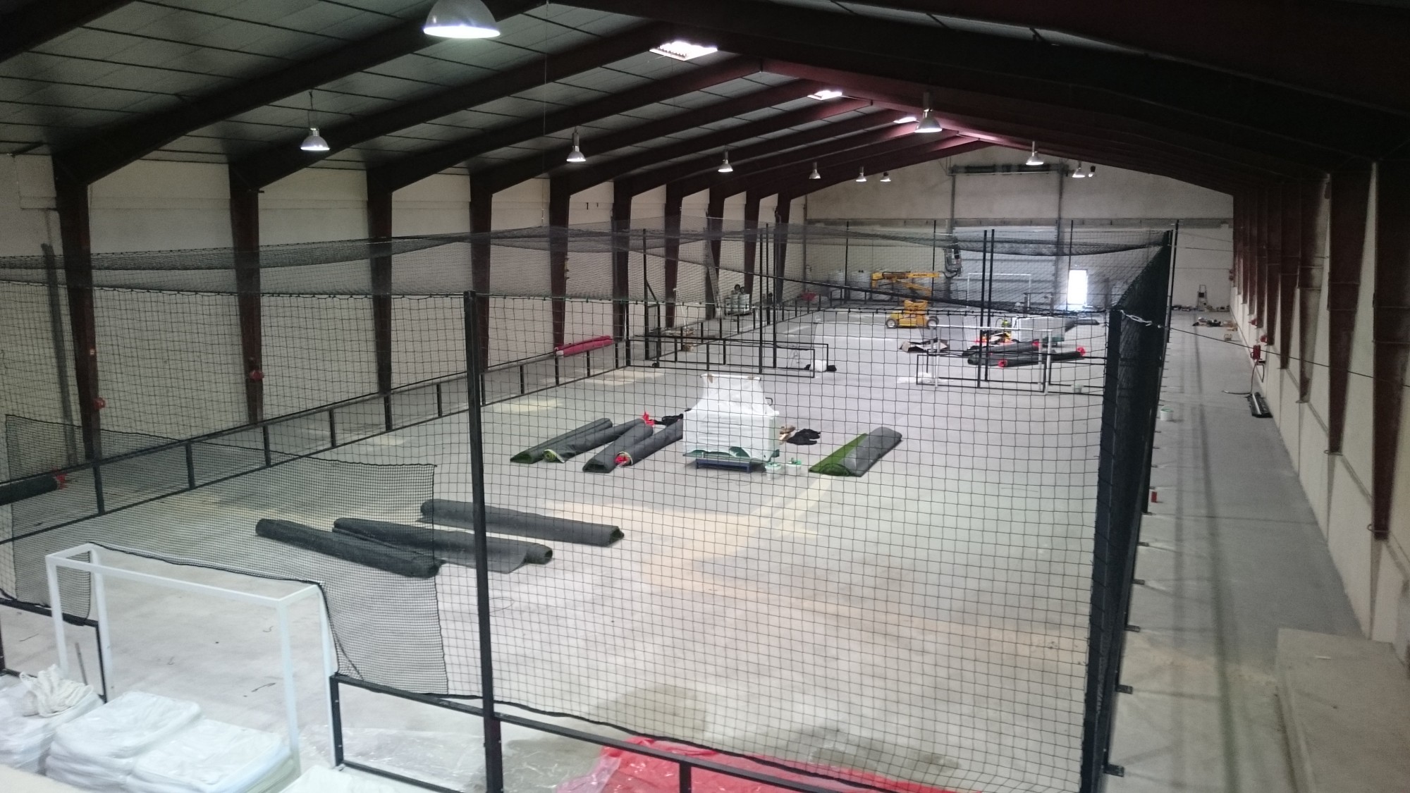 Les filets en polyamide entourant le terrain de futsal sont ensuite installés.il s’agit dans le cas présent de filets de 100 mm de maille.Les pourtours de cages de but sont équipés de filets de 45 mm de maille pour pallier aux tirs à répétition des footballeurs et à l’usure prématurée de la fibre et son effilement.Les filets de but sont doublés d'un filet amortissant pour stopper les tirs.