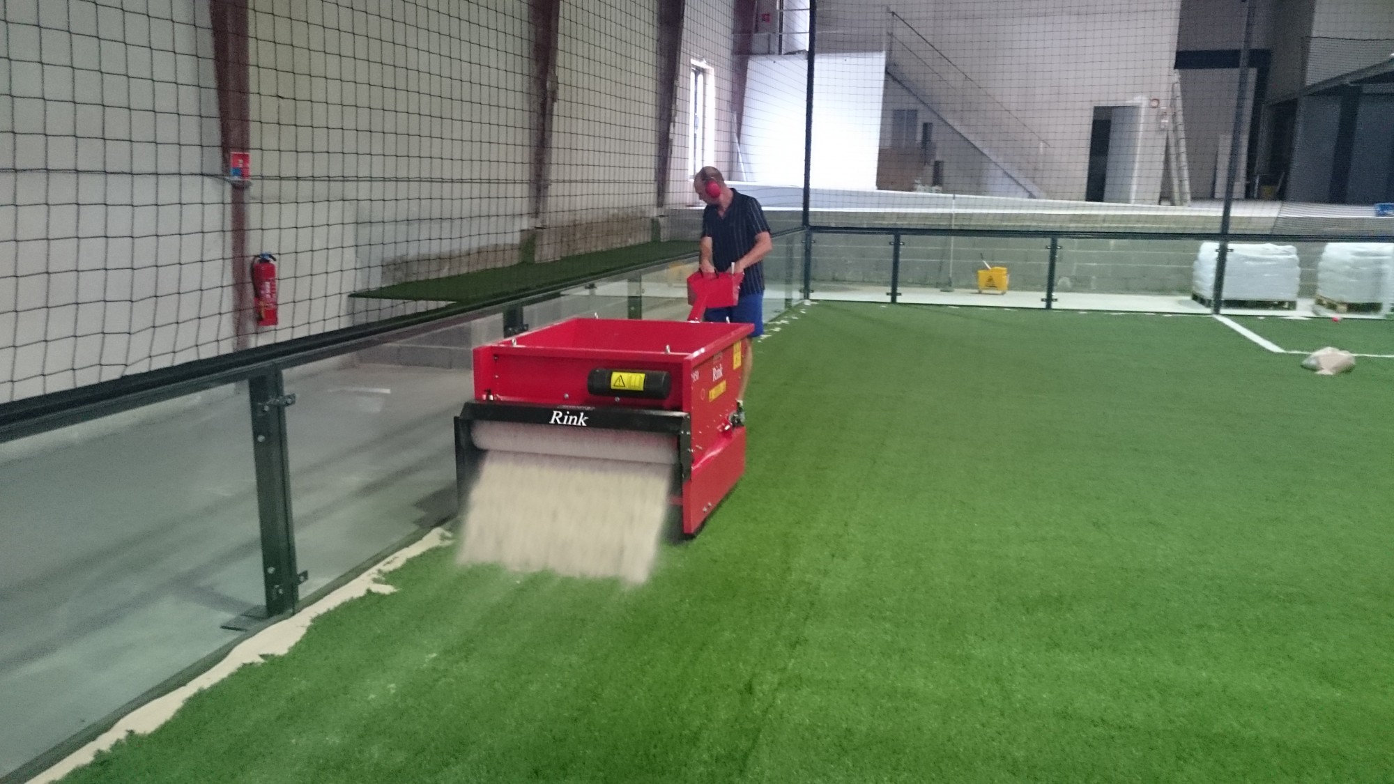 Une fois le produit positionné et collé ,Universgazons utilise une sableuse et des brosses rotatives mécaniques afin de faire pénétrer la silice dans le gazon de manière uniforme ;même opération avec le granulat caoutchouc de couleur verte.Le dosage est de 17 kg au mètre carré pour la silice et de 8 kg pour le granulat caoutchouc.